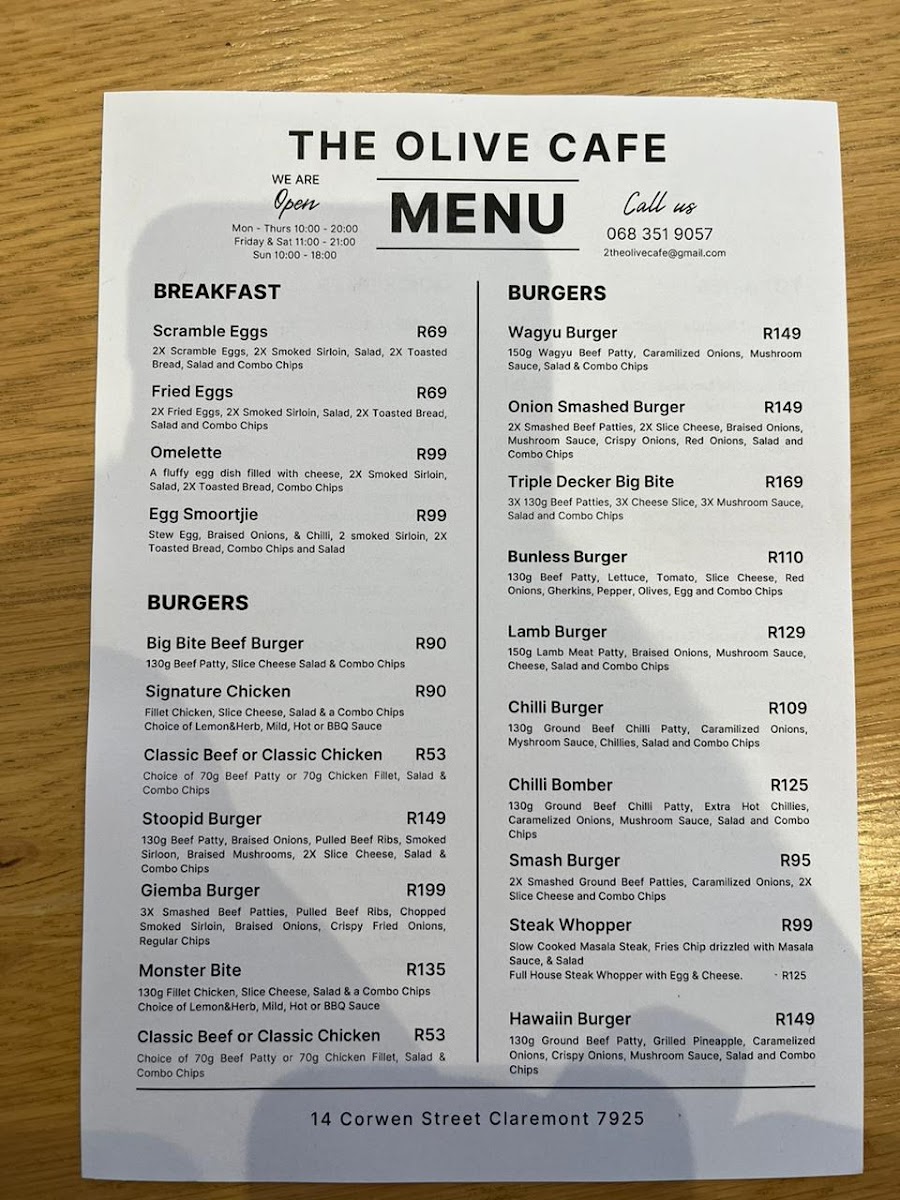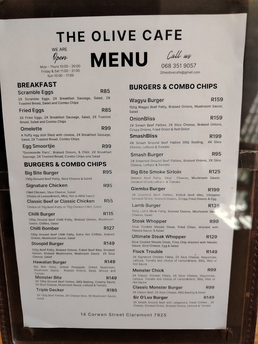 Welcome to The Olive Cafe - Claremont (Halaal), a hidden gem in Cape Town's bustling Claremont district. Nestled at 14A Corwen St, this delightful cafe specializes in an array of mouthwatering dishes that cater to any craving. The star of the menu is undoubtedly their burgers, ranging from the classic beef and chicken options to the indulgent Big Bite Beef Burger, which boasts a perfectly cooked patty topped with cheese and their special mushroom sauce.